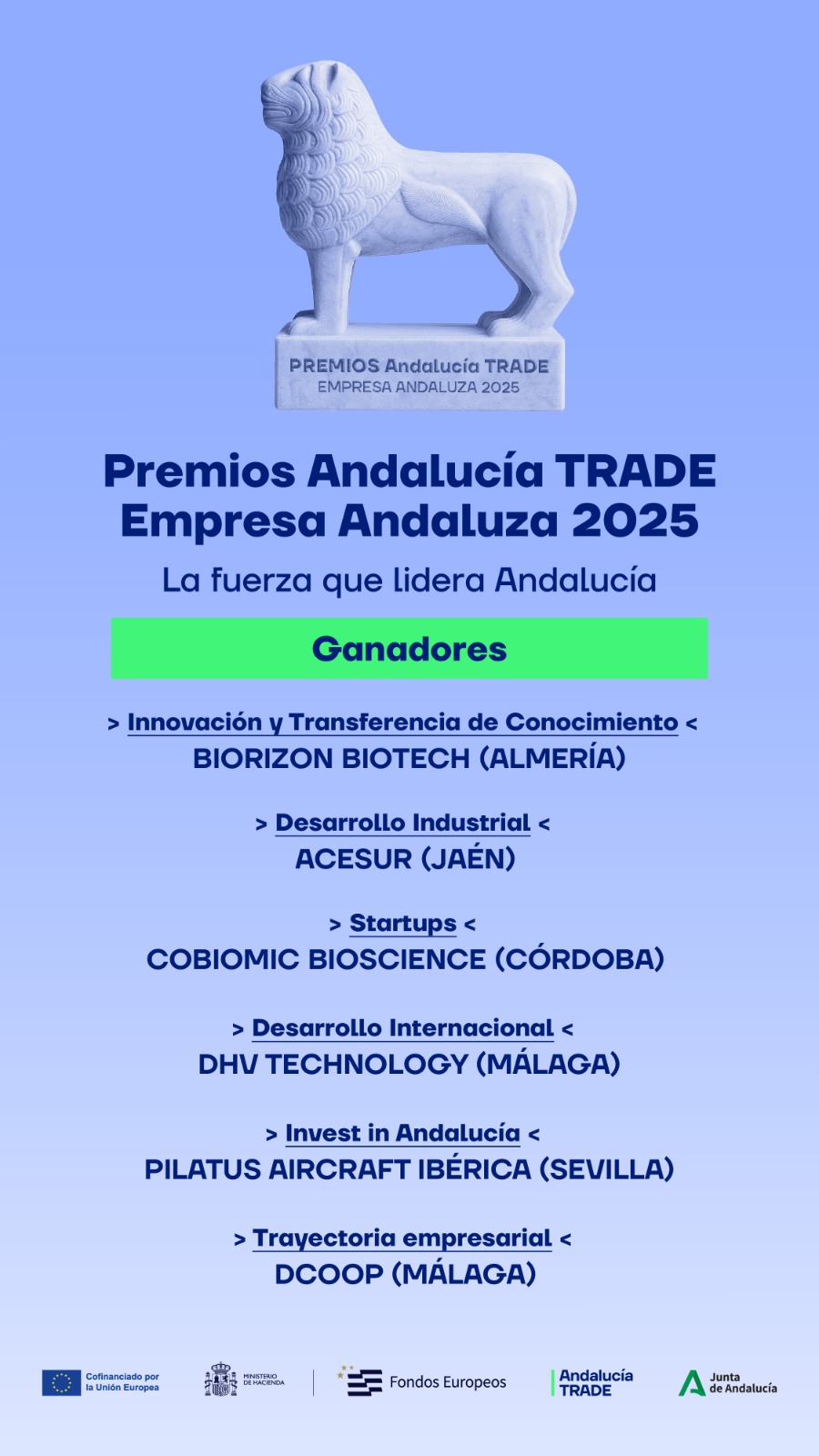 Las empresas Dcoop, Pilatus Aircraft Ibérica,Acesur, Biorizon Biotech, Cobiomic Bioscience y DHV Technology han sido elegidas ganadoras de la Iª Edición de los Premios Andalucía TRADE Empresa Andaluza 2025 por el jurado regional de estos galardones organizados por la Consejería de Economía, Hacienda, Fondos Europeos y Diálogo Social, a través de Andalucía TRADE.