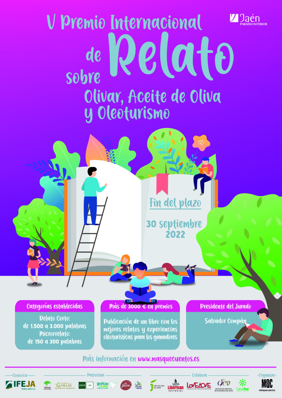 Estos son los cuentos y autores galardonados en este concurso literario convocado por Ferias Jaén y organizado por la Asociación Cultural Másquecuentos (MQC), que este año ha contado con el patrocinio de la Fundación Unicaja Jaén, la SCA San Vicente de Mogón y su AOVE Puerta de Las Villas, la UNED de Jaén, Gráficas La Paz, el Centro de Interpretación del Aceite y el Olivar de Úbeda y la IGP Aceite de Jaén; y la colaboración de la Diputación Provincial de Jaén, la editorial Líberman, la empresa Love AOVE, la Asociación Española de Municipios del Olivo (AEMO) y la RTVA.
