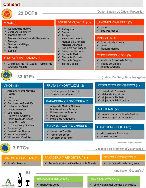 En la actualidad la comunidad cuenta con 29 Denominaciones de Origen Protegidas (DOP) de las que 12 pertenecen al sector del aceite de oliva, 8 a vinos, 3 a vinagres, 2 a jamones y paletas, una al sector de frutas y hortalizas y 3 a otros productos. En cuanto a Identificaciones Geográficas Protegidas (IGP) en la actualidad hay 33 de los que 16 pertenecen al sector del vino, 5 al del pan y la repostería, 4 a productos pesqueros, 3 a jamones, paletas y carnes, 2 a frutas y hortalizas, 2 a aceitunas y otros 2 a otros productos. En los casos del Jamón de Jabugo y el Cordero Segureño, se tratan de DOP e IGP respectivamente de ámbito suprautonómico.